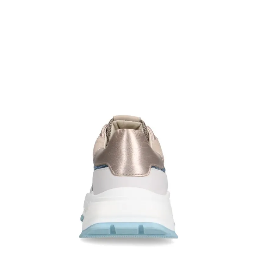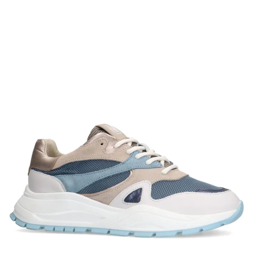 Blauwe denim sneakers van Manfield. Deze sneakers zijn aan de buitenkant gemaakt van leer, suède en stof en aan de binnenkant van leer. Deze sneakers zijn voorzien van een vetersluiting en de zool heeft een hoogte van 4 cm. We adviseren als verzorging en bescherming de Natural Trendspray.