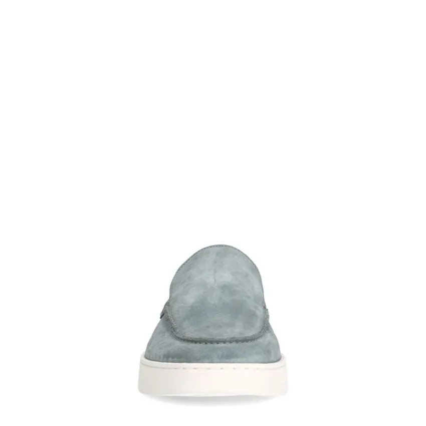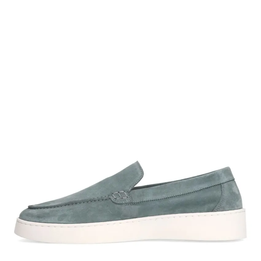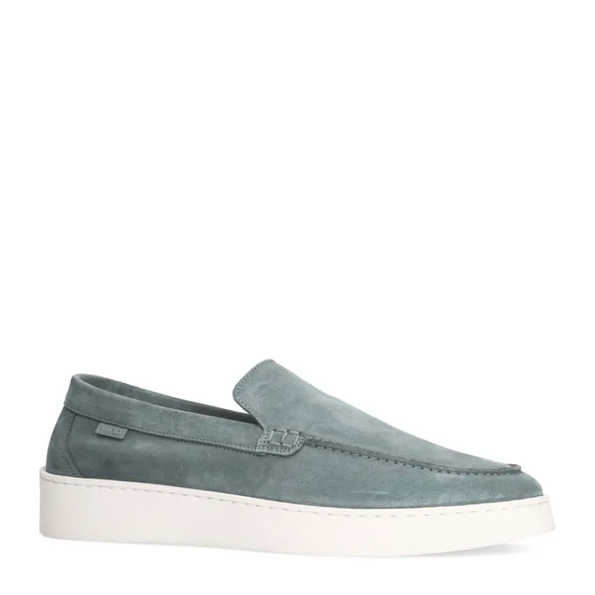 Blauwe suède loafers van Manfield met een witte zool van 3 cm. We adviseren als verzorging en bescherming suède/nubuck spray in transparant.