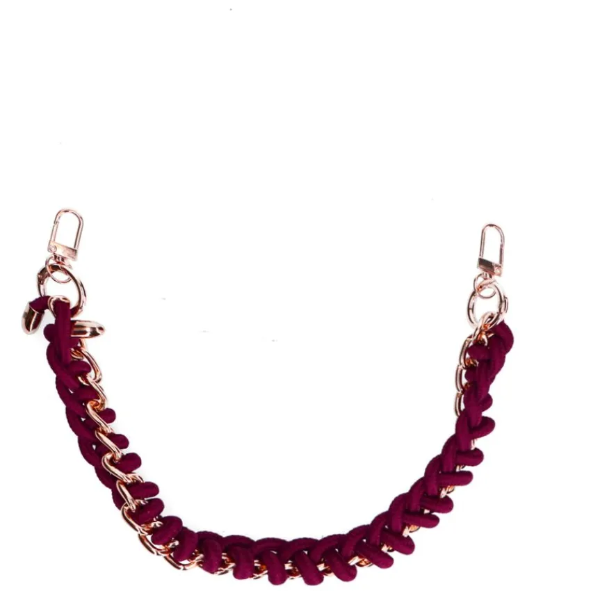 Bordeaux rode bag charm met gouden details van Manfield met klipsluiting. De tashanger heeft een lengte van 30 cm en is 2 cm breed.