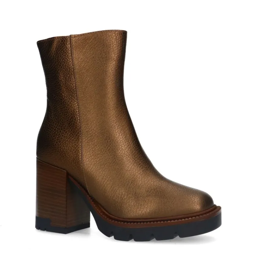 Bronskleurige leren enkellaarsjes van Manfield. Deze laarsjes hebben een blokhak van circa 8 cm. Deze laarsjes zijn gemaakt van leer en daarom raden we je aan deze dames laarzen te verzorgen en beschermen met de Collonil Carbon Pro. Deze dames laarsjes kunnen gesloten worden doormiddel van een rits.