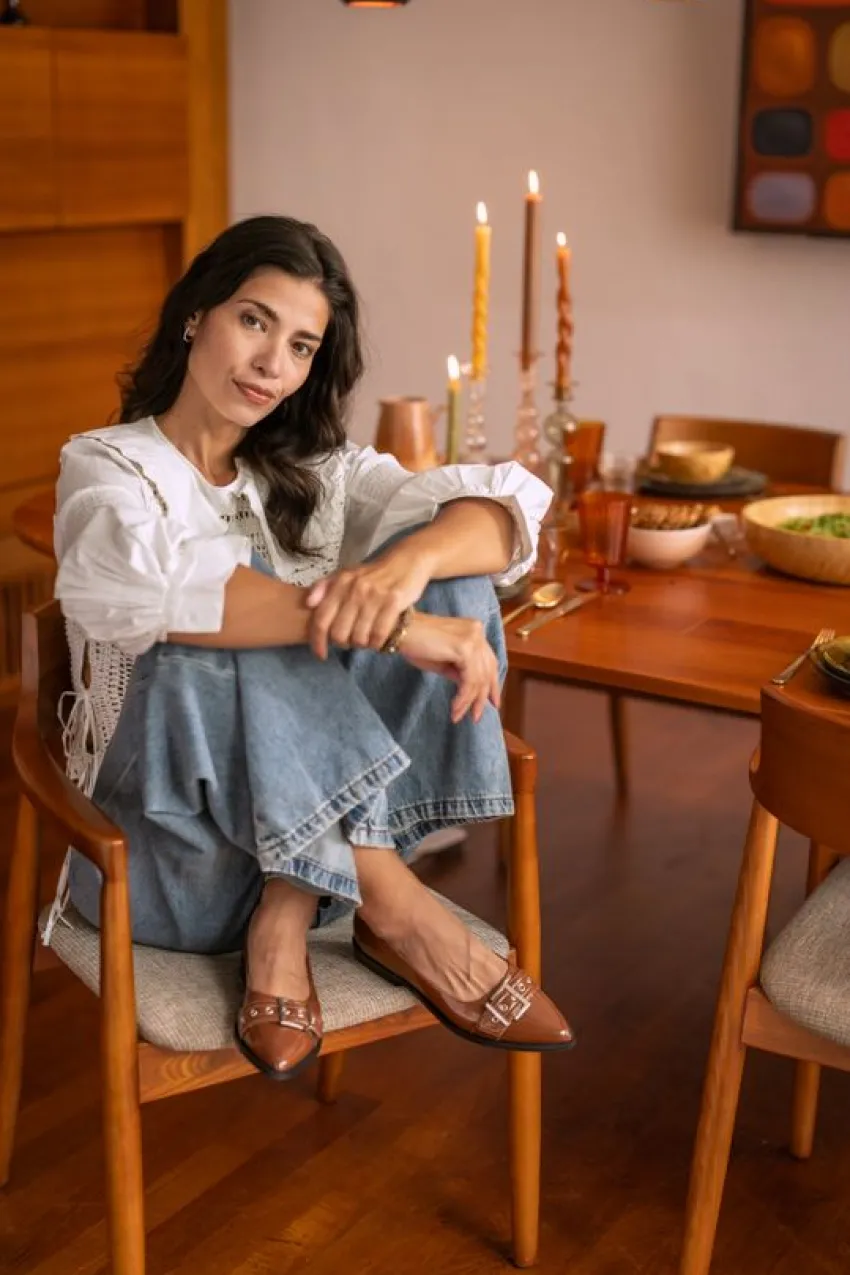 Bruine lakleren ballerina’s van Manfield met een gesp over de voorvoet. De ballerina’s hebben een puntneus en een platte hak van 2 cm. We adviseren als verzorging en bescherming de Collonil Carbon Pro.