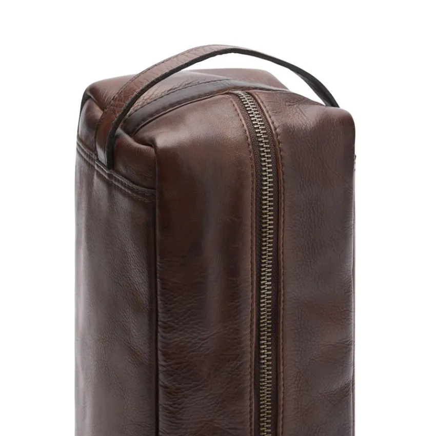 Bruine leren toilettas van Manfield met ritssluiting. De afmeting van de toilettas is 25x14x12 cm (BxHxD).