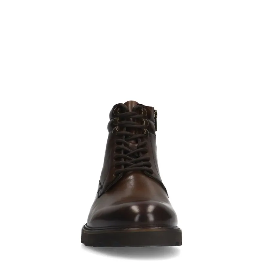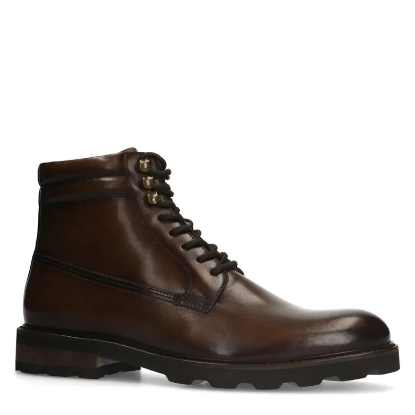 Bruine leren veterboots van Manfield met hak van 3 cm. De boots hebben een ritssluiting aan de binnenzijde. We adviseren als verzorging en bescherming de Collonil Carbon Pro.