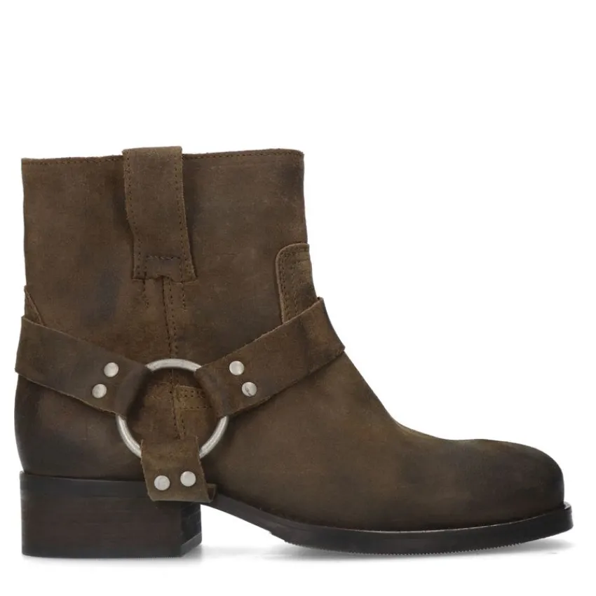 Bruine suède biker boots van Manfield. Deze biker boots zijn gemaakt van suède en daarom raden we je aan deze dames boots te verzorgen en beschermen met de Collonil Carbon Pro. Deze boots zijn voorzien van zilverkleurige gespjes en zijn voorzien van een platte blokhak van 3 cm hoog.