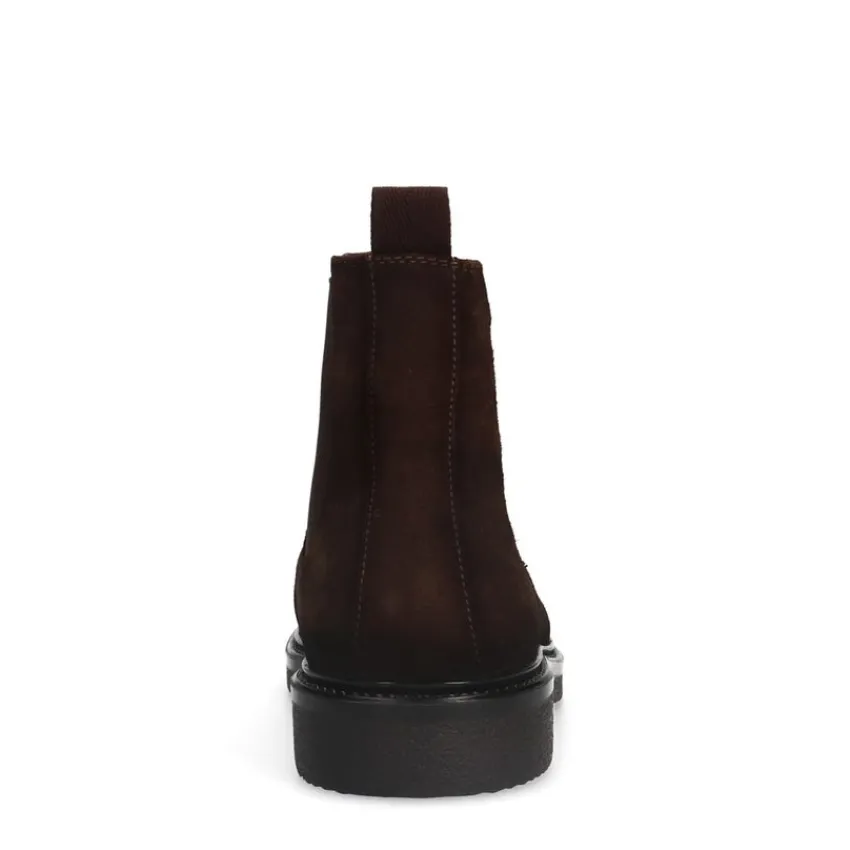 Bruine suède chelsea boots van Manfield met een platte hak van 2 cm. We adviseren als verzorging en bescherming de suède/nubuck spray in transparant.