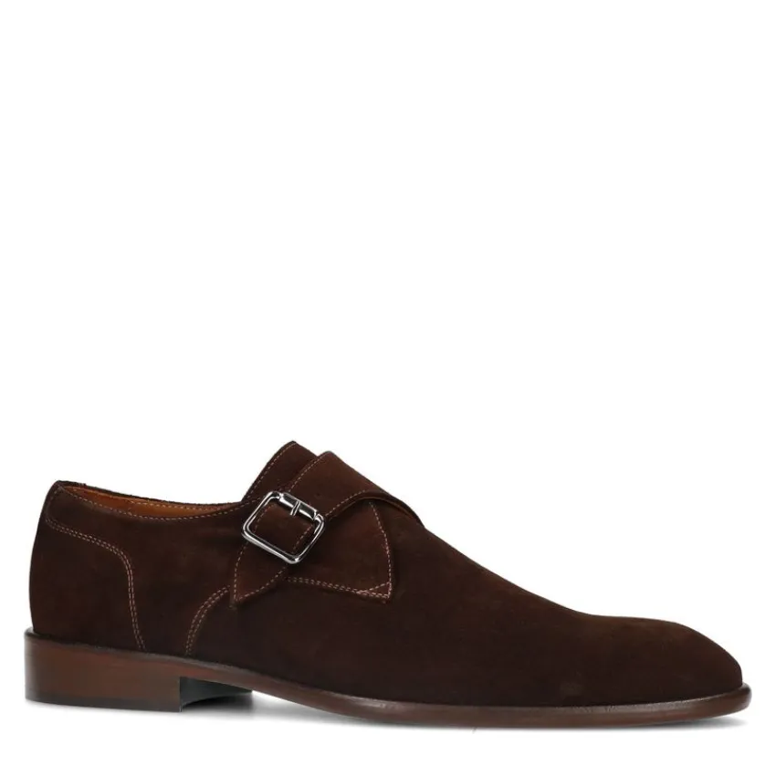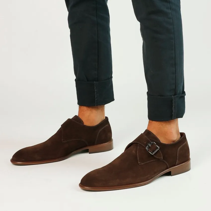 Bruine suède gespschoenen van Manfield. Deze gespschoenen zijn gemaakt van suède en daarom raden we je aan deze gespschoenen te verzorgen en beschermen met de Collonil Carbon Pro. Deze nette heren schoenen zijn voorzien van één gesp rond de voorvoet. Draag ze onder een pak of in combinatie met een pantalon en een blouse.