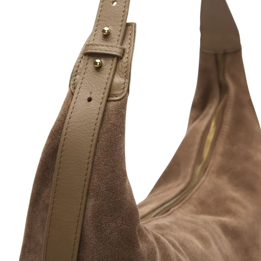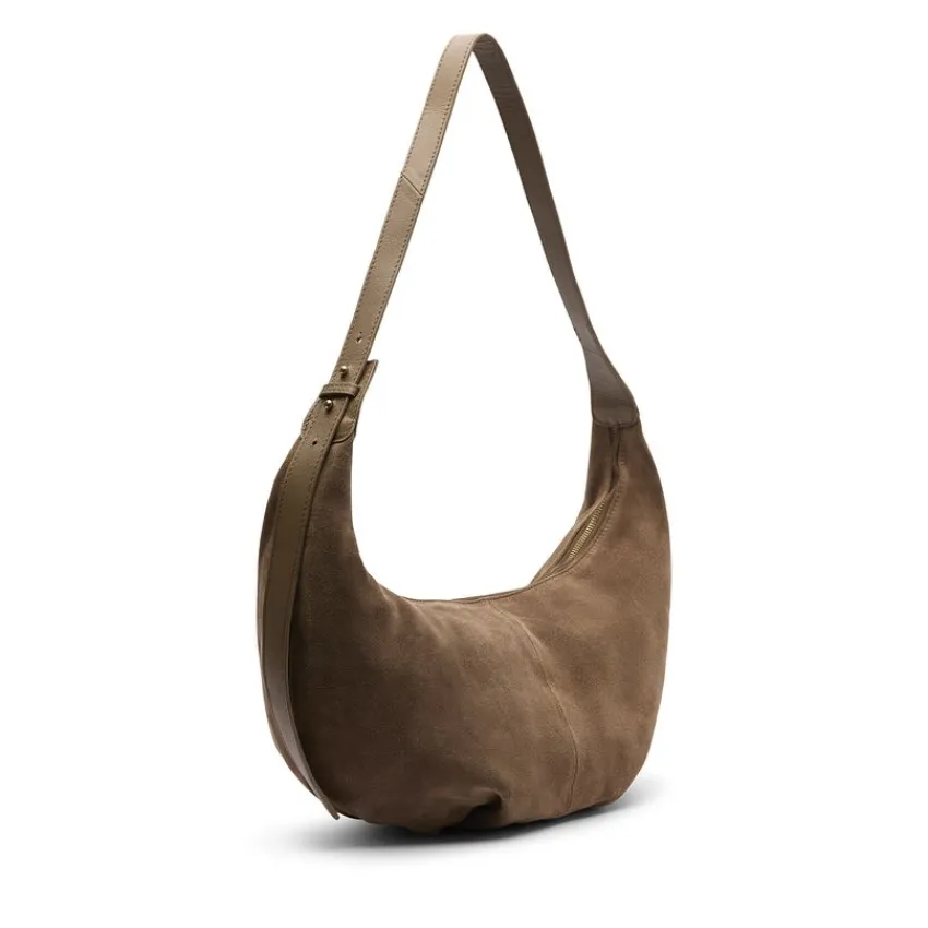 Bruine suède schoudertas van Manfield met verstelbare schouderband. De afmeting van deze tas is 46x21x13 cm (BxHxD), voorzien van een ritssluiting.