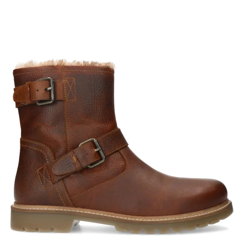 Cognac leren boots van Manfield met gespjes aan de zijkant, hak van 3 cm en ritssluiting. We adviseren als verzorging en bescherming de Collonil Carbon Pro.