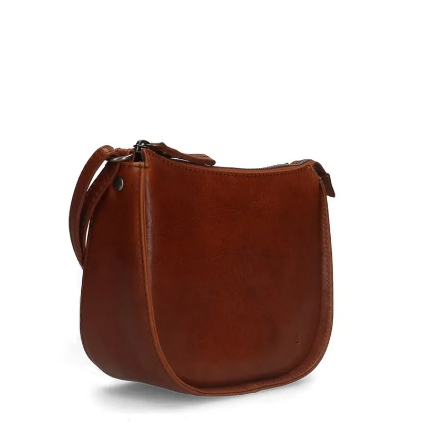 Cognac leren schoudertas van Manfield met ritssluiting en verstelbare band van 115 cm. De tas heeft een afmeting van 20x15x7 cm (BxHxD).