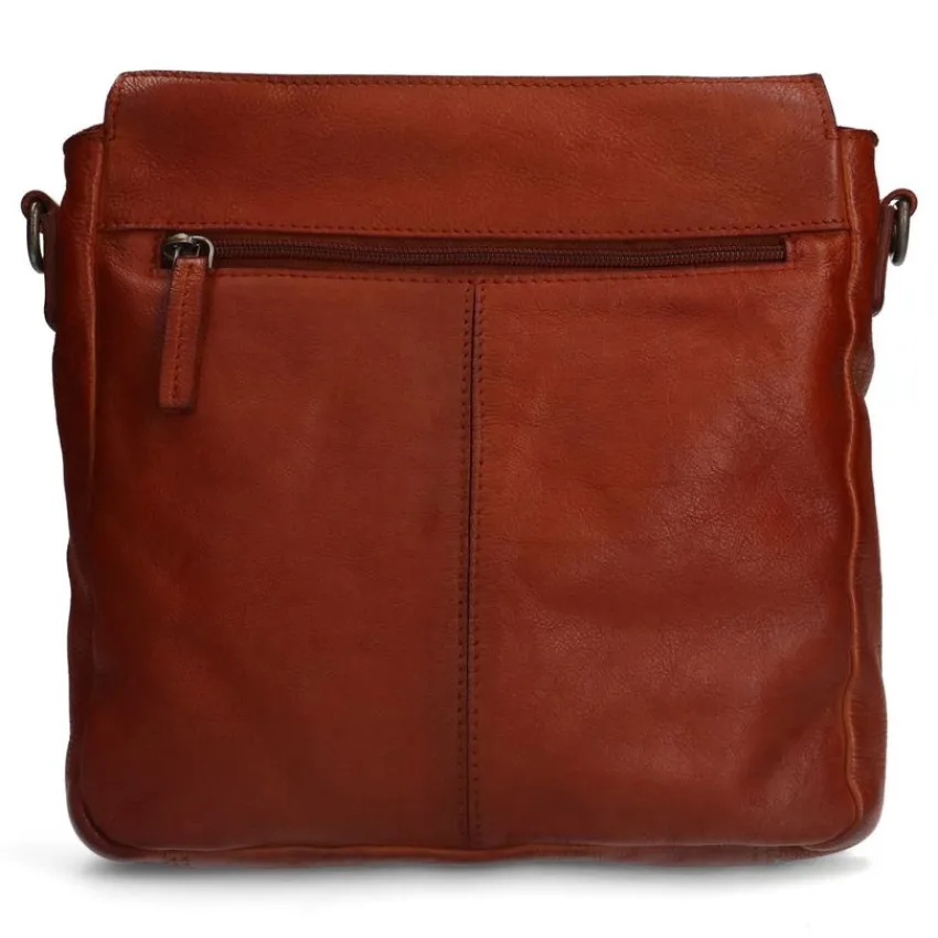 Cognac leren schoudertas van Manfield. De afmeting van deze tas is 27x25x7 cm (BxHxD), voorzien van verstelbare schouderband van 150 cm en een ritssluiting aan de bovenkant en zijkant. We adviseren als verzorging en bescherming de Collonil Carbon Pro.