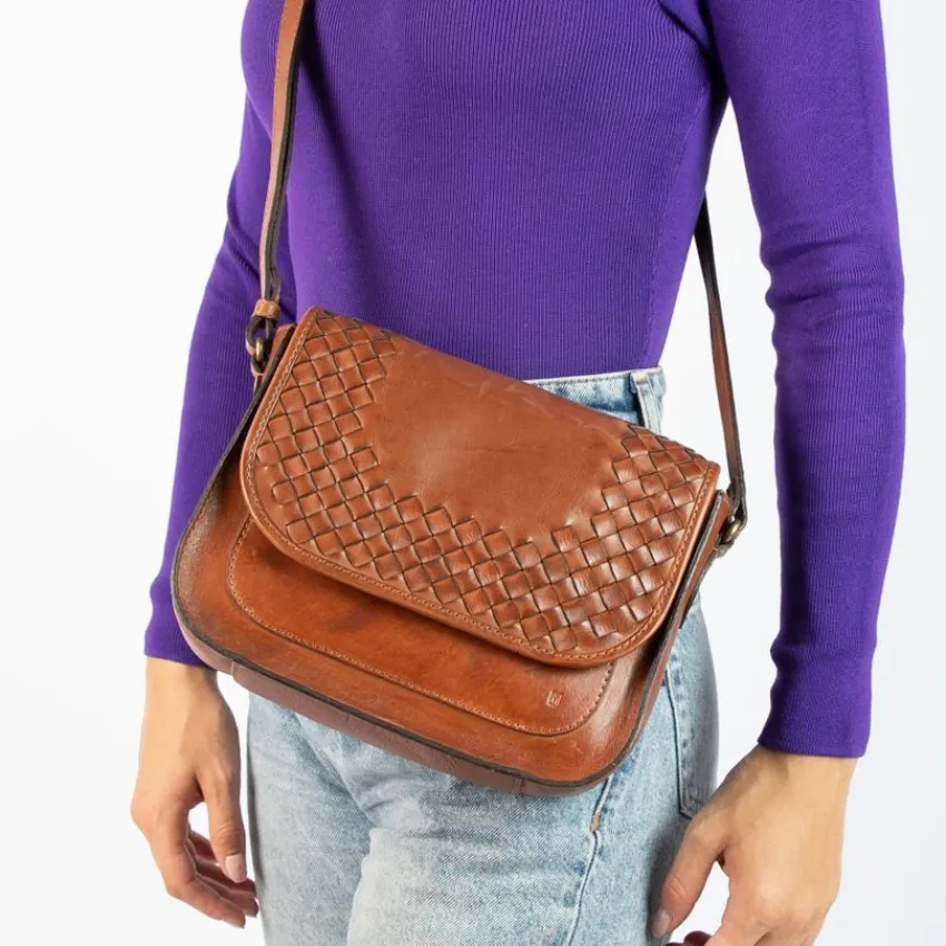 Cognac leren schoudertas van Manfield. Deze cognac kleurige schoudertas is gemaakt van leer en daarom raden we je aan deze tas voor dames te verzorgen en beschermen met de Collonil Carbon Pro. Deze tas is voorzien van een ronde afwerking en beschikt over gevlochten stof aan de flap. De schouderband heeft een maximale lengte van 130 cm en is verstelbaar. Deze dames tas heeft de afmeting 25x18x7 (BxHxD). Deze schoudertas kan gesloten worden door middel van een magnetische sluiting en de binnenzijde is voorzien van een ritssluiting en diverse opbergvakjes.