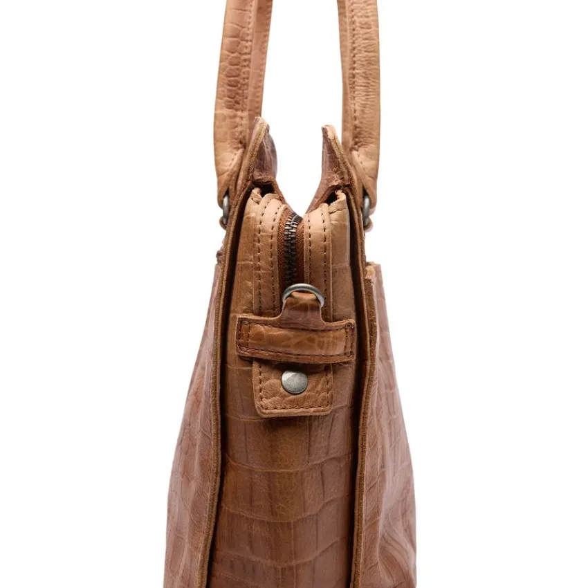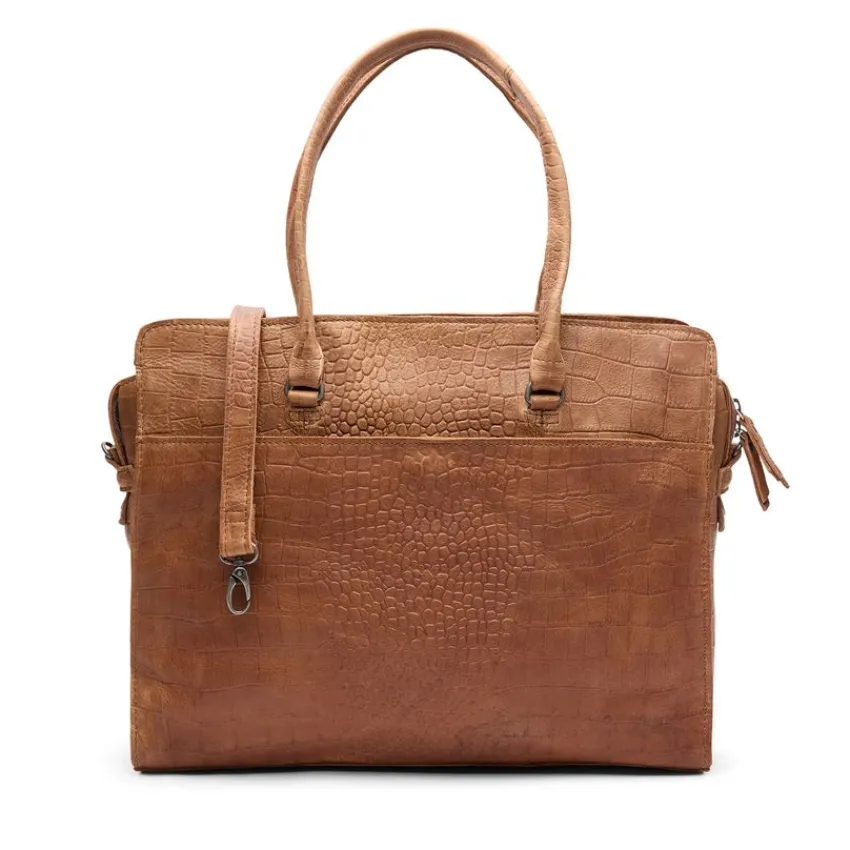 Cognac leren shopper met crocoprint van het merk Manfield. De afmeting van deze tas is 41x31x16 (BxHxD). Aan de achterkant van de tas dit een ritvakje en aan de voorkant van de tas zit een groot vak met drukknoop. De tas sluit door middel van een rits. Aan de binnenkant van de tas zitten drie vakjes, één van de vakjes sluit door middel van een ritssluiting. Het grote binnenvak sluit door middel van klittenband en het derde vakje heeft geen sluiting. Er zit een verstelbaar hengsel bij de tas met een totale lengte van 188 cm.