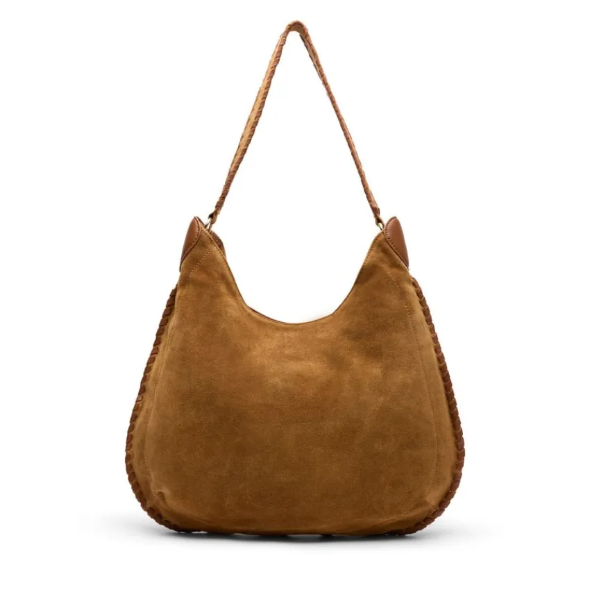 Cognac suède handtas met gevlochten details van Manfield. De afmeting van deze tas is 43x32x7 cm (BxHxD), voorzien van een drukknoop sluiting.
