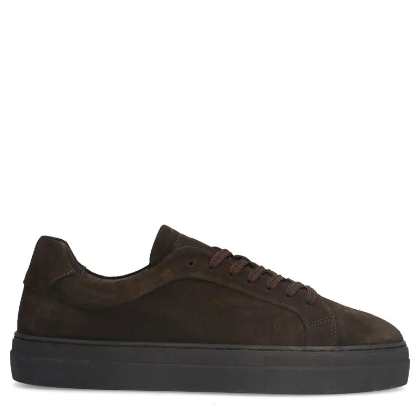 Donker bruine suède sneakers van Manfield met zwarte zool van 4 cm. We adviseren als verzorging en bescherming de suède/nubuck spray in transparant.