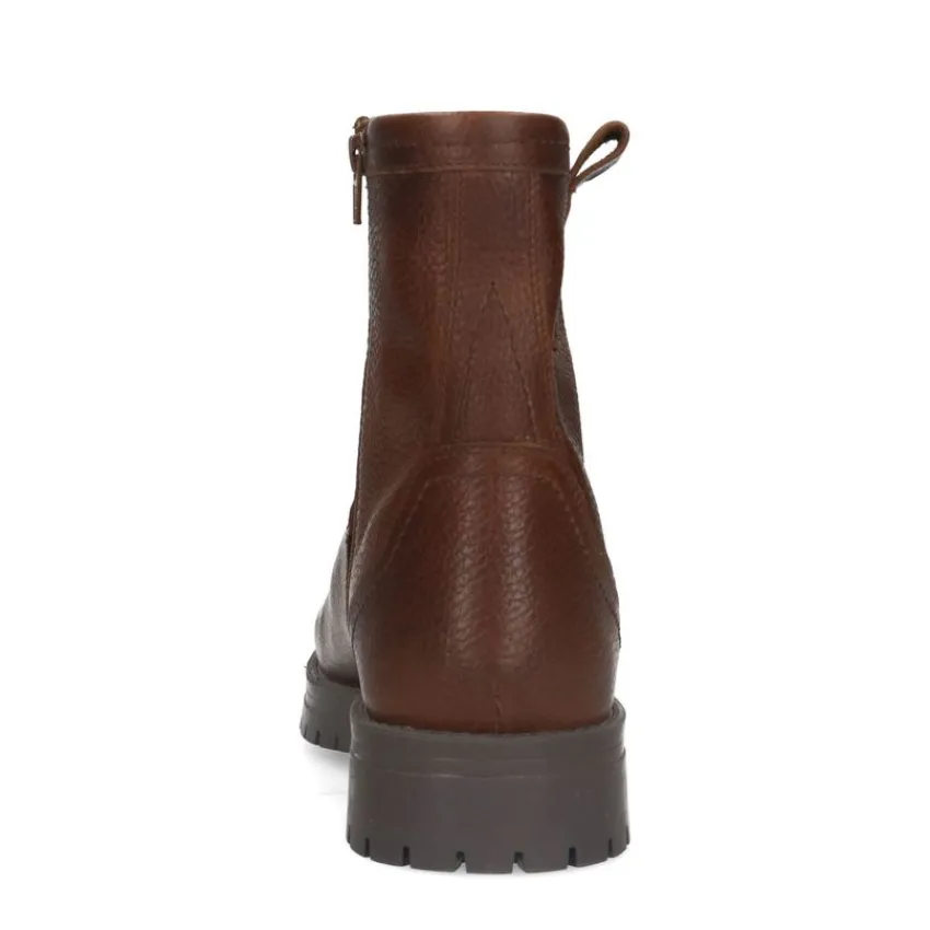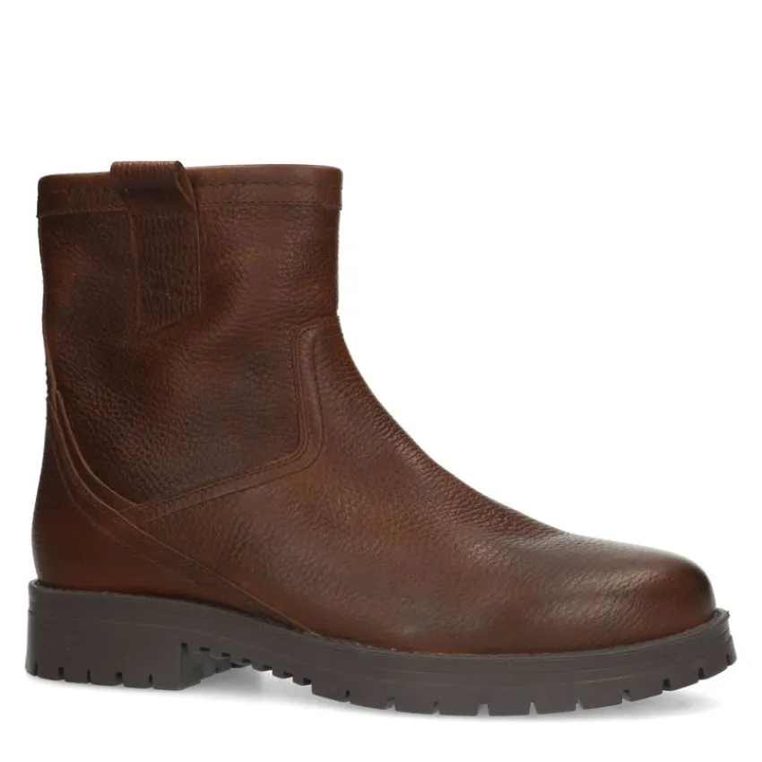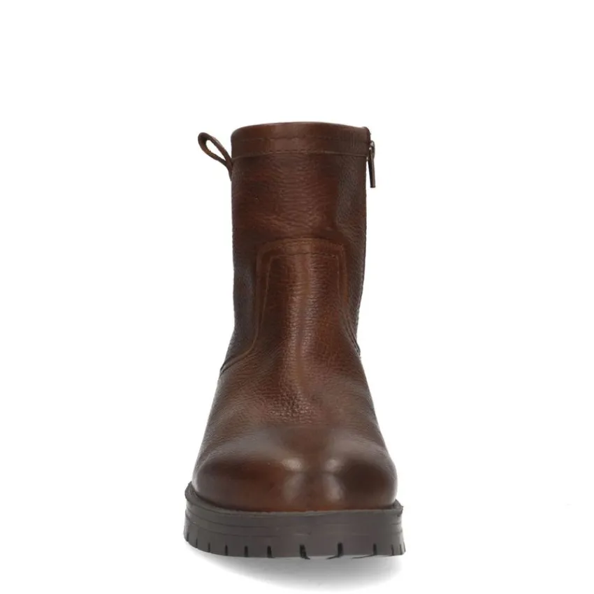 Donkerbruine leren boots van Manfield. Deze heren boots zijn gemaakt van leer en de binnenzijde is voorzien van een teddy materiaal. We raden je aan deze boots te verzorgen en beschermen met de Collonil Carbon Pro. De diepe profielen in de zool zorgen voor extra grip en de hakhoogte is 2 cm. Deze herenschoen kan gesloten worden door middel van een rits.