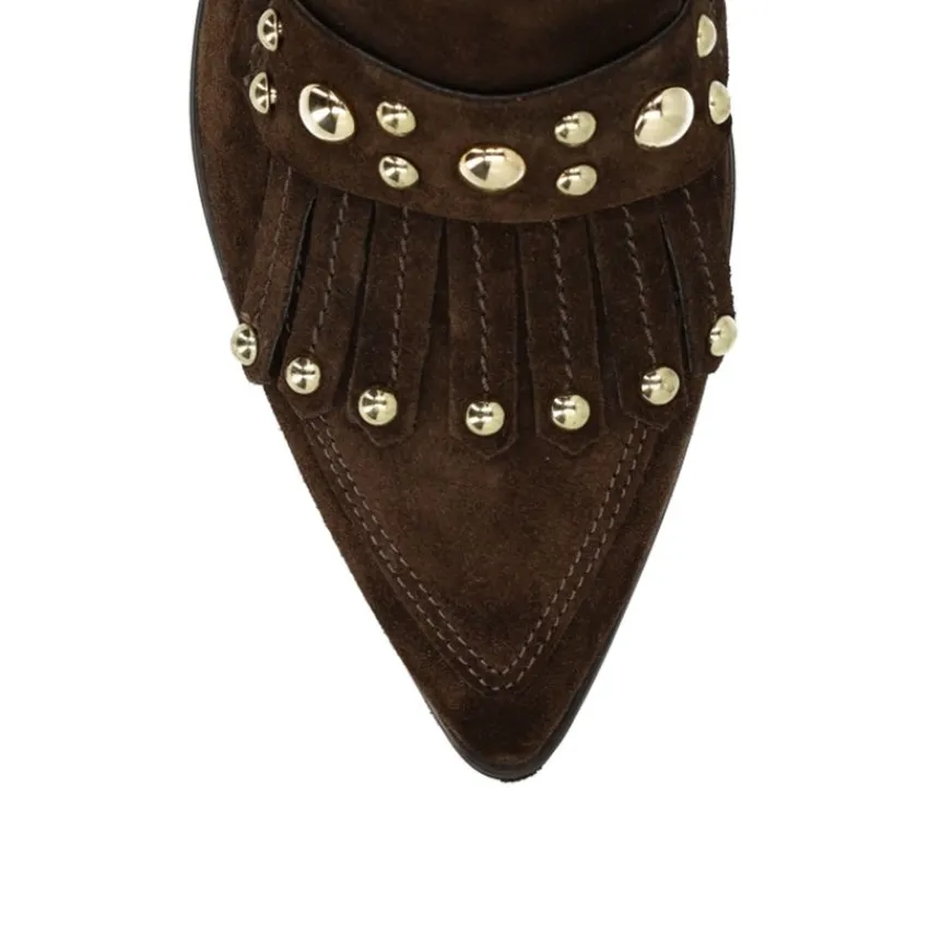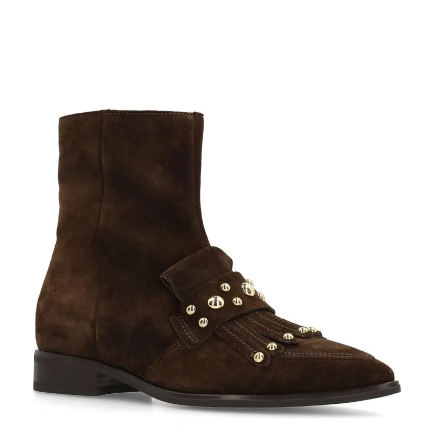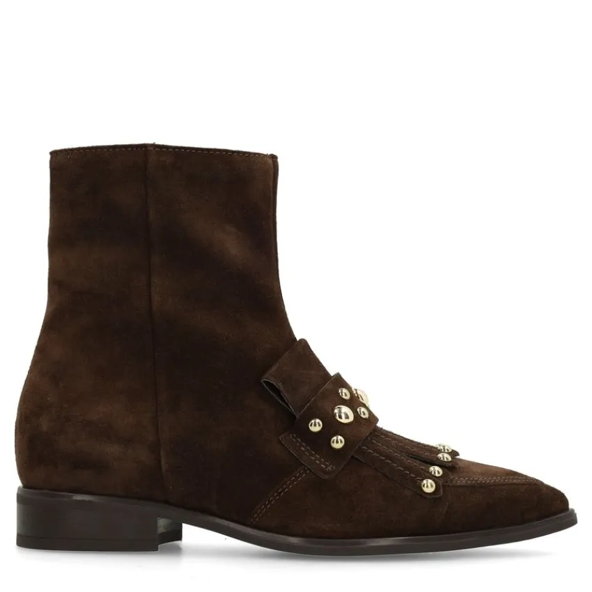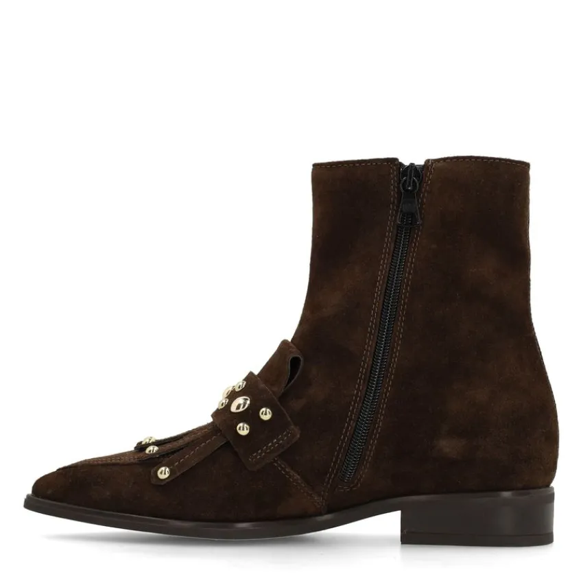 Donkerbruine suède enkellaarsjes met studs details op de voorvoet van Manfield. De enkellaarsjes hebben een puntneus, ritssluiting aan de binnenzijde en platte hak van 2 cm. We adviseren als verzorging en bescherming de suède/nubuck spray in transparant.