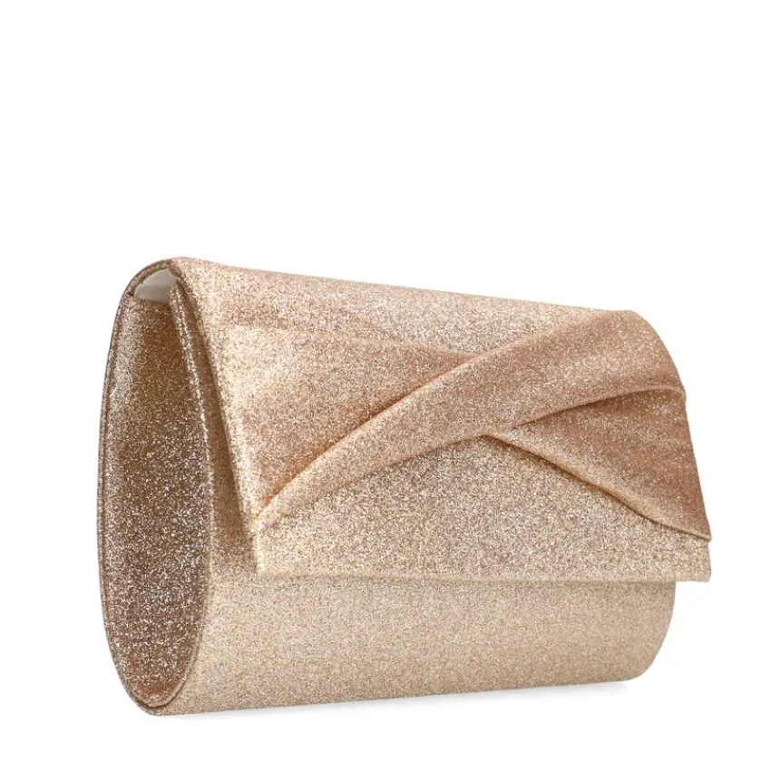 Gouden glitter clutch van Manfield met drukknoop sluiting. De afmeting van de clutch is 21x14x4 cm (BxHxD), voorzien van zilveren strap van 115 cm.