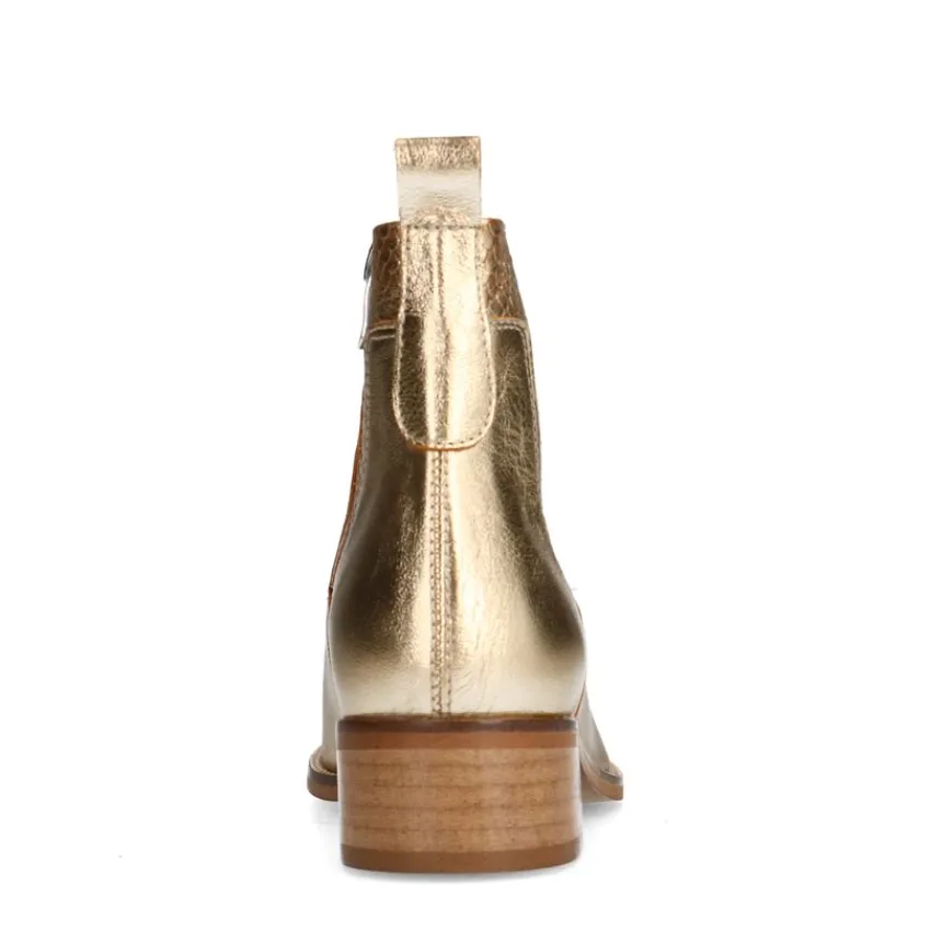 Gouden leren cowboylaarsjes van Manfield, met een blokhak van 3 cm. De laarsjes hebben een ronde neus en een ritssluiting aan de binnenzijde. We adviseren als verzorging en bescherming de Collonil Carbon Pro.