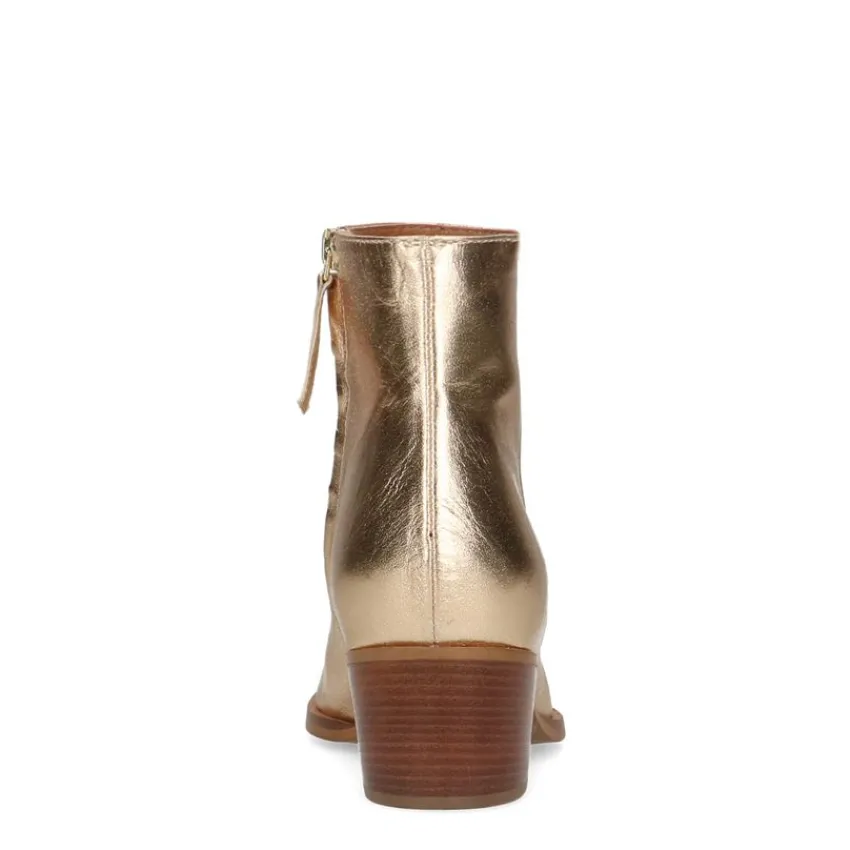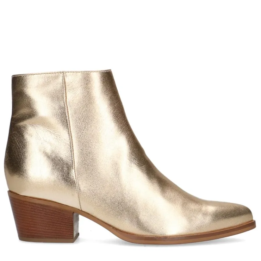 Goudkleurige leren enkellaarsjes van Manfield met een puntige neus en platte hak van 3 cm. We adviseren als verzorging en bescherming de Collonil Carbon Pro of metallic spray.
