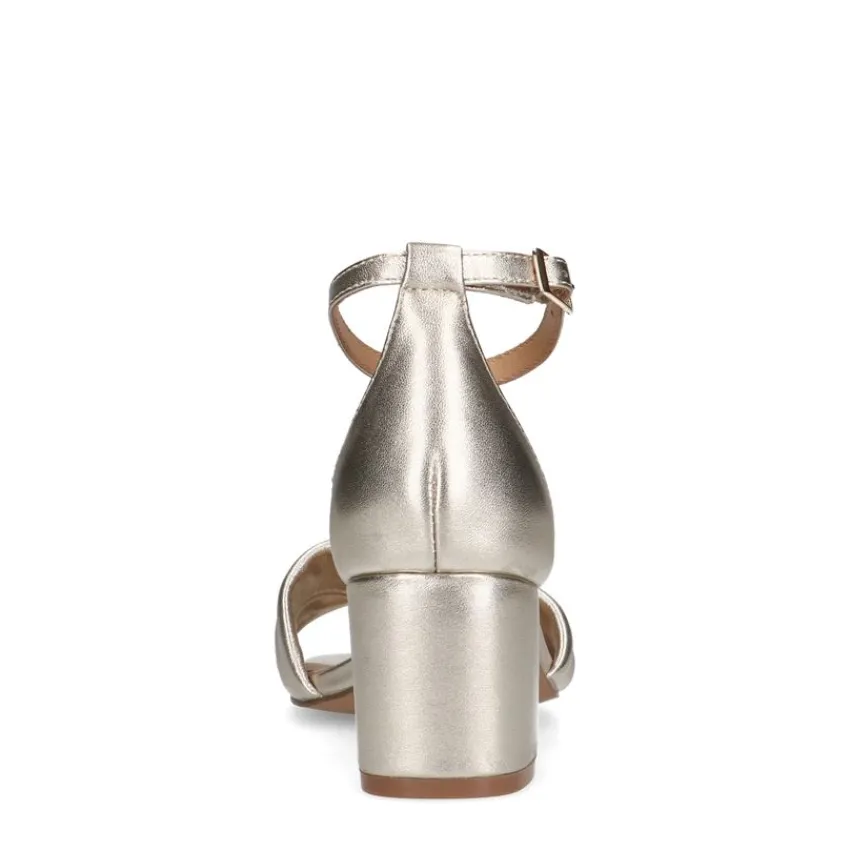 Goudkleurige leren sandalen met hak van Manfield. Deze hakken kunnen gesloten worden door middel van een enkelbandje met gesp en hebben een hakhoogte van 6 cm. We adviseren als verzorging en bescherming de Collonil Carbon Pro.
