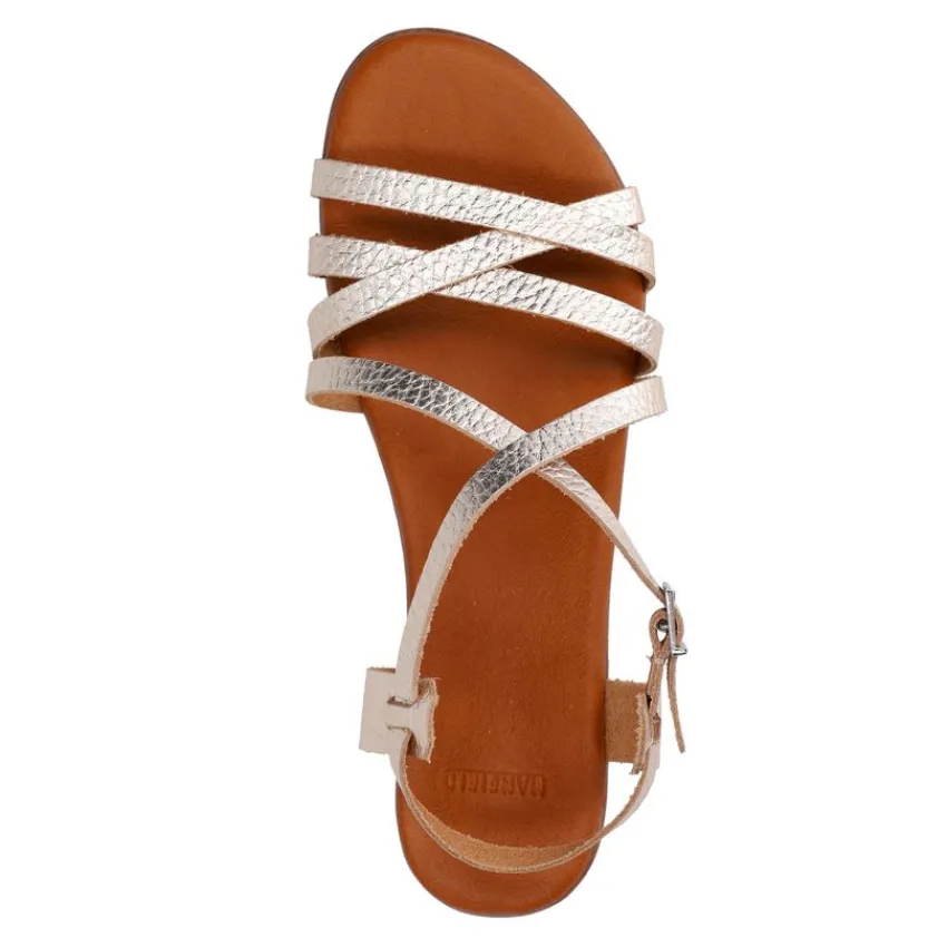 Gouden leren sandalen van Manfield met platte zool van 1 cm, gespsluiting rondom de enkels en gekruiste bandjes die over de voorvoet lopen. We adviseren als verzorging en bescherming de Collonil Carbon Pro.
