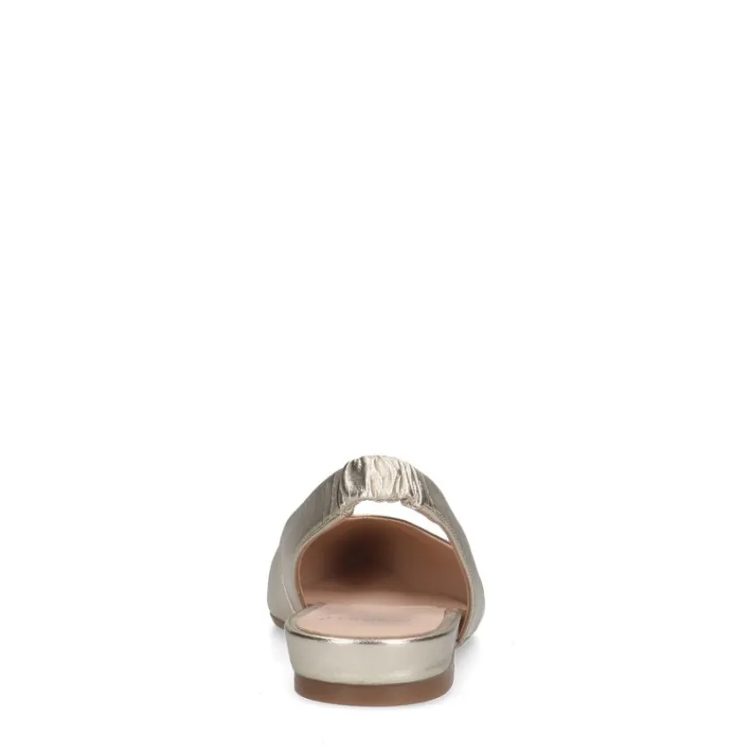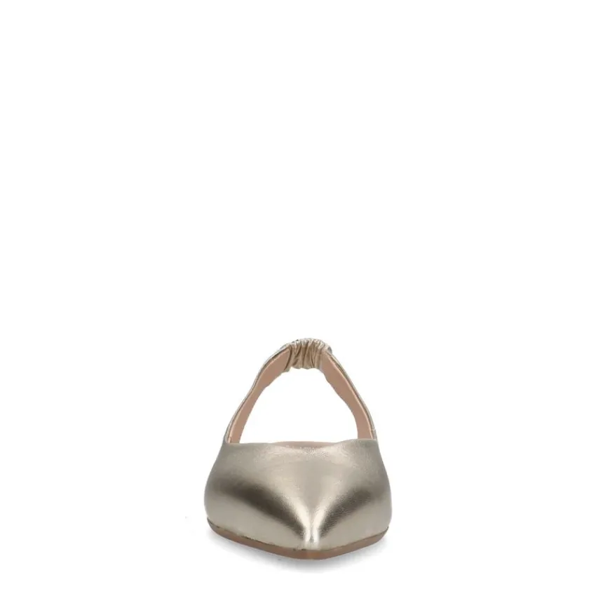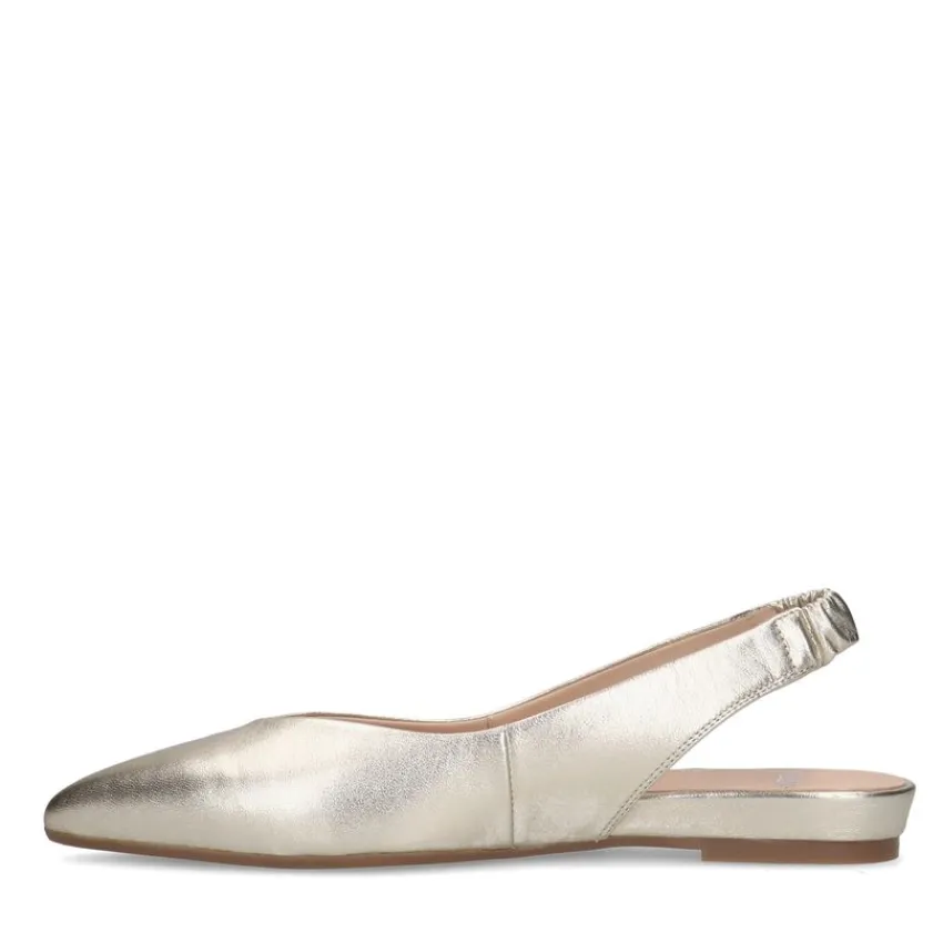 Gouden leren slingback ballerina’s van Manfield met elastieken sluiting en een puntige neus. We adviseren als verzorging en bescherming de Collonil Carbon Pro.