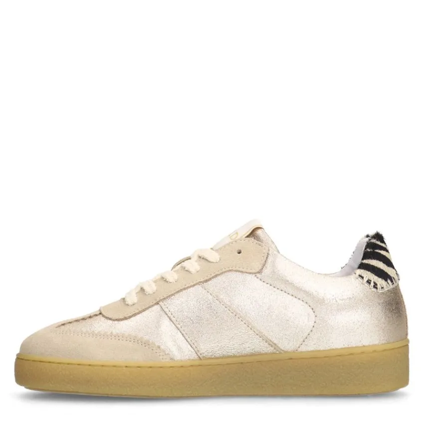 Gouden leren sneakers van Manfield met zebra details. De sneakers hebben een bruine rubberen zool van 3 cm. We adviseren als verzorging en bescherming de Collonil Carbon Pro.