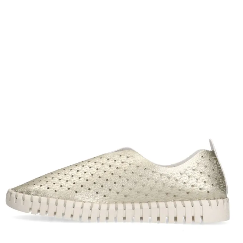 Gouden loafers Manfield en bestaan uit 50% polyurethaan en 50% nylon. Door het M patroon in deze sandalen komt Manfield hier in terug en bovendien hebben ze een uitneembaar voetbed.