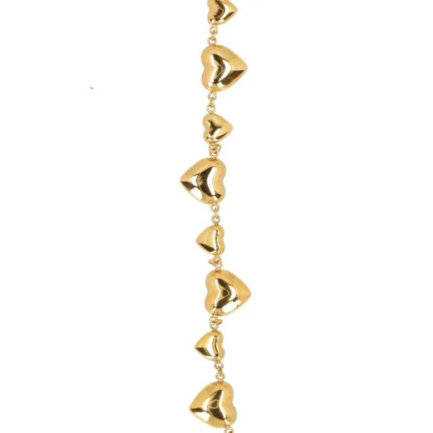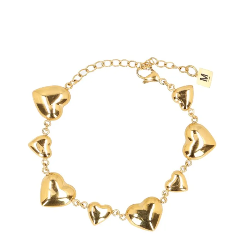Goudkleurige hartjes bedelarmband van Manfield. De bedeltjes hebben kleine en grote hartjes. Materiaal buitenzijde staal…