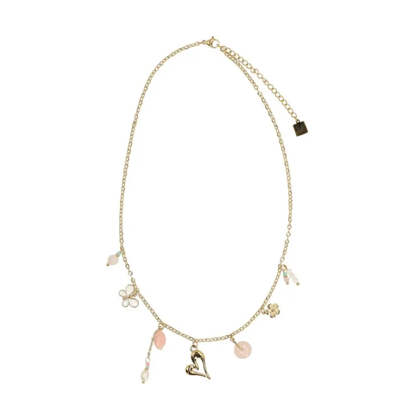 Goudkleurige ketting met bedeltjes van Manfield. De ketting heeft bedeltjes met roze en witte details.