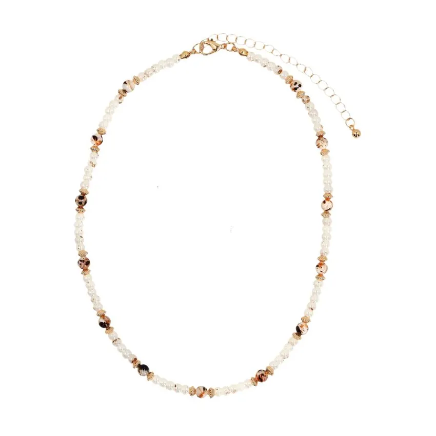 Goudkleurige ketting met witte kralen van Manfield met een totale lengte van 41 cm. Wegens hygiënevoorschriften kunnen sieraden niet geretourneerd worden.