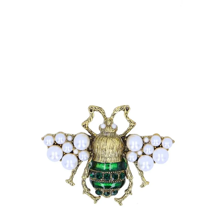 Goudkleurige kever broche van Manfield met groene en parel details. De broche heeft een breedte van 5 cm en een lengte van 4 cm.