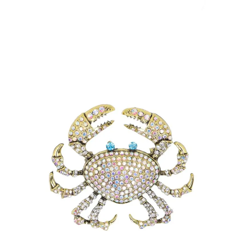 Goudkleurige krabben broche van Manfield met strass details. De broche is 7 cm breed en 6 cm lang.