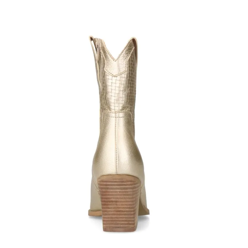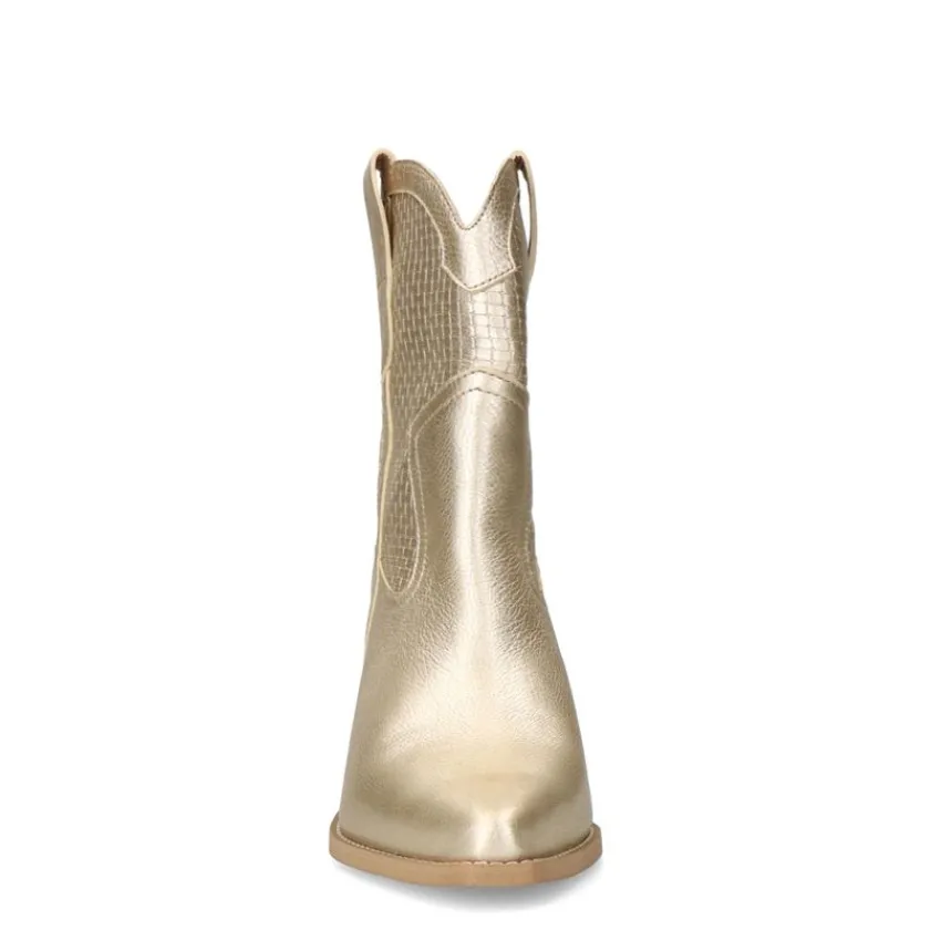 Goudkleurige leren cowboylaarzen van Manfield met een blokhak van 7 cm. De laarzen hebben een puntvormige neus en ritssluiting aan de binnenzijde. We adviseren als verzorging en bescherming de Collonil Carbon Pro.