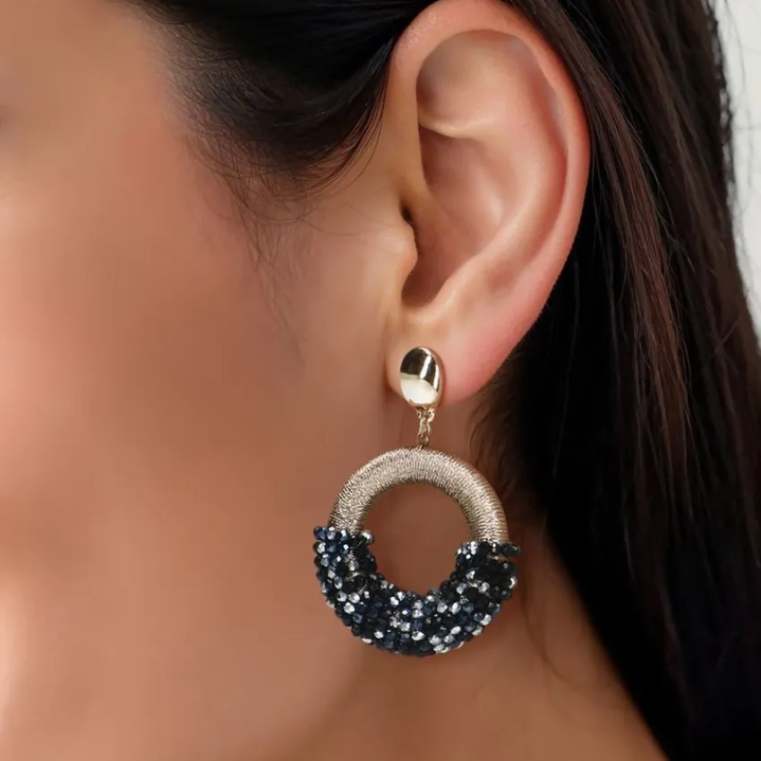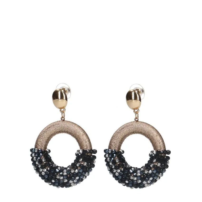 Goudkleurige oorbellen met zwarte glaskralen van Manfield. De oorbellen zijn synthetisch, zijn 4 cm lang en 3,5 cm breed. Wegens de algemene hygiënevoorschriften kan dit artikel niet geretourneerd worden.