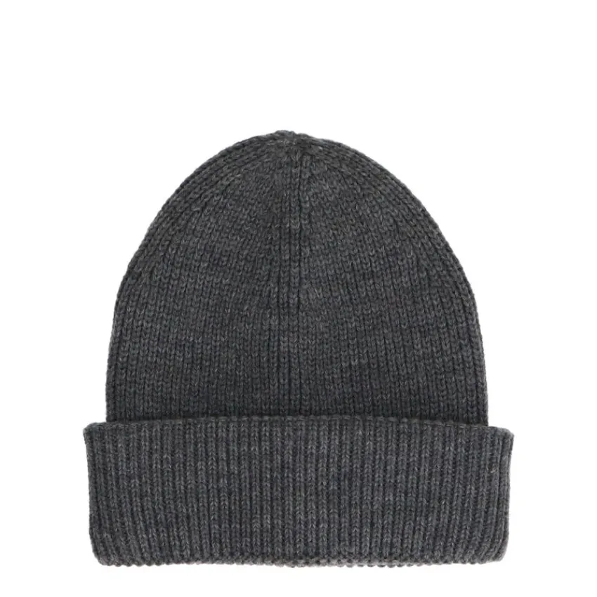 Grijze beanie van Manfield met ribbels, breedte van 20 cm en lengte van 22 cm.