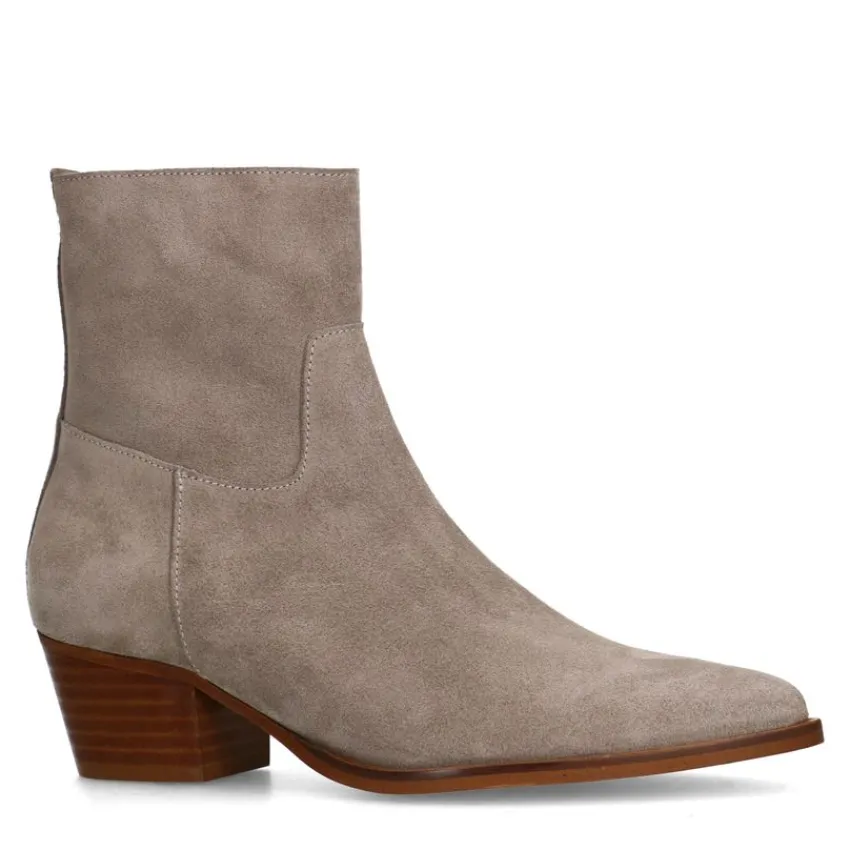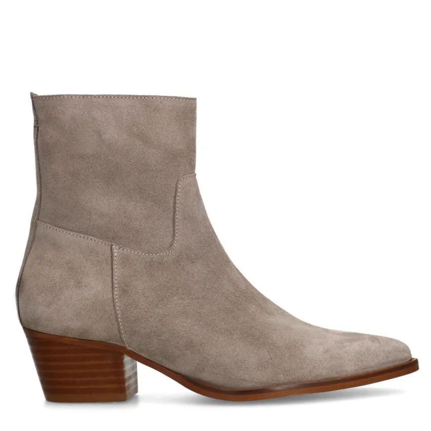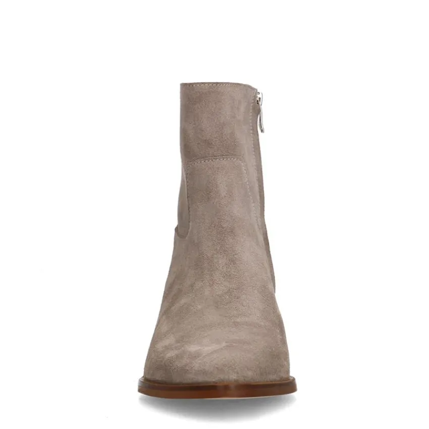 Grijze suède enkellaarsjes met hak van Manfield. De enkellaarsjes hebben een rits aan de binnenzijde en een schuin afgesneden blokhak van 5 cm. We adviseren als verzorging en bescherming de suède/nubuck spray in transparant.