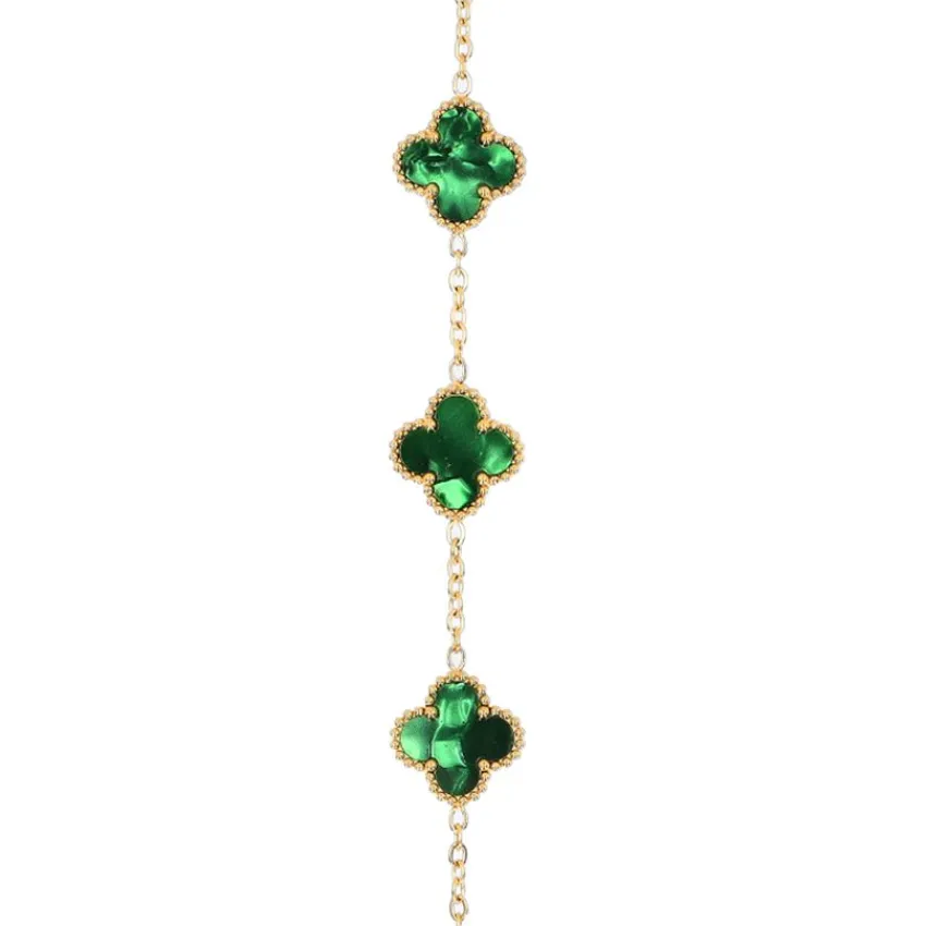 Groene klavertjes armband van Manfield met goudkleurig randje eromheen. De armband is gemaakt van stainless steel.