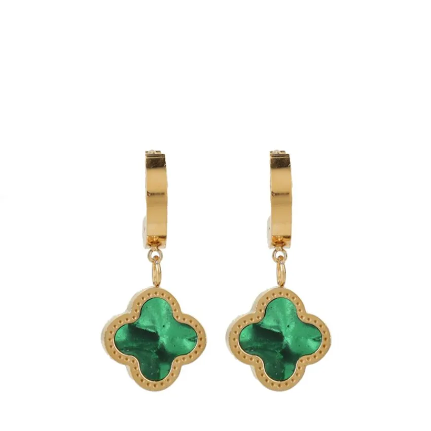 Groene klavertjes oorbellen van Manfield, gemaakt van stainless steel met een goudkleurig randje eromheen en hebben een druksluiting.