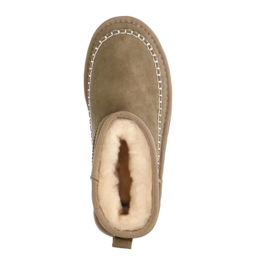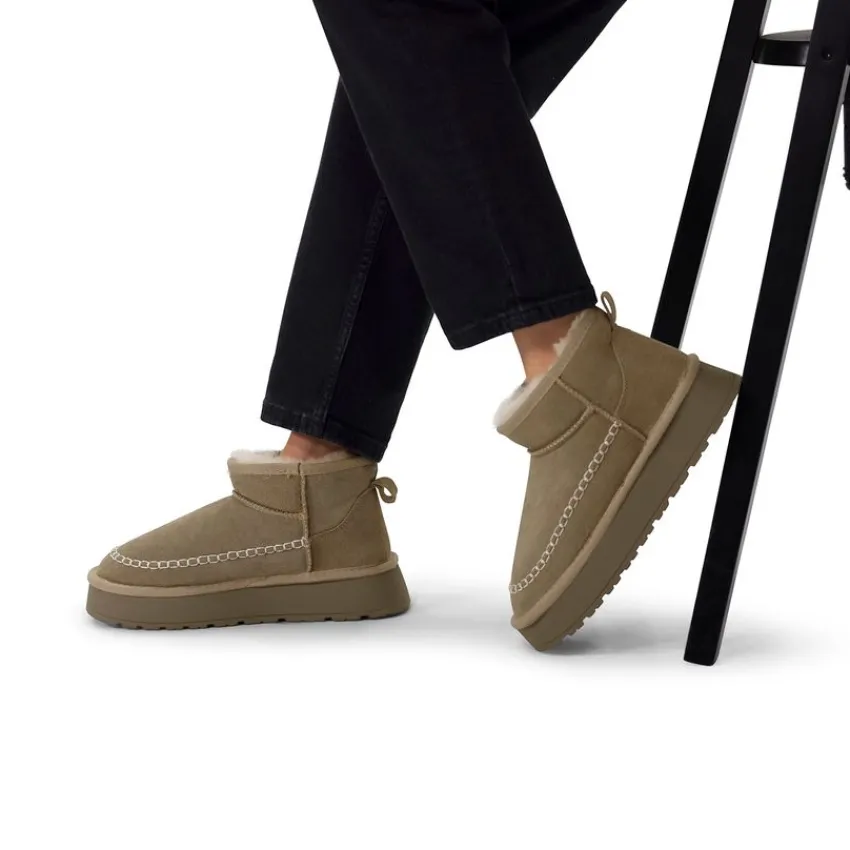 Groene suède snowboots van Manfield met plateauzool van 4 cm, wol aan de binnenzijde en witte gestikte details. We adviseren als verzorging en bescherming de suède/nubuck spray in transparant.