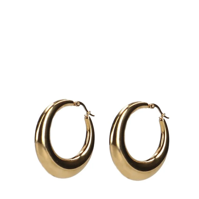 Grote ronden goudkleurige oorbellen van het merk Manfield. De oorbellen zijn gemaakt van stainless steel. De oorbellen zijn 4 cm lang. Wegens de algemene hygiënevoorschriften kan dit artikel niet geretourneerd worden.