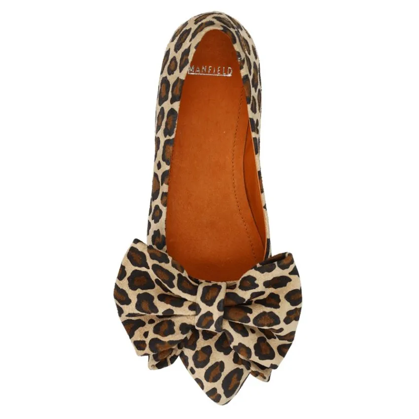 Leopard suède loafers van Manfield met een strik op de voorvoet en platte hak van 1 cm. We adviseren als verzorging en bescherming de Suède/nubuck spray in transparant.