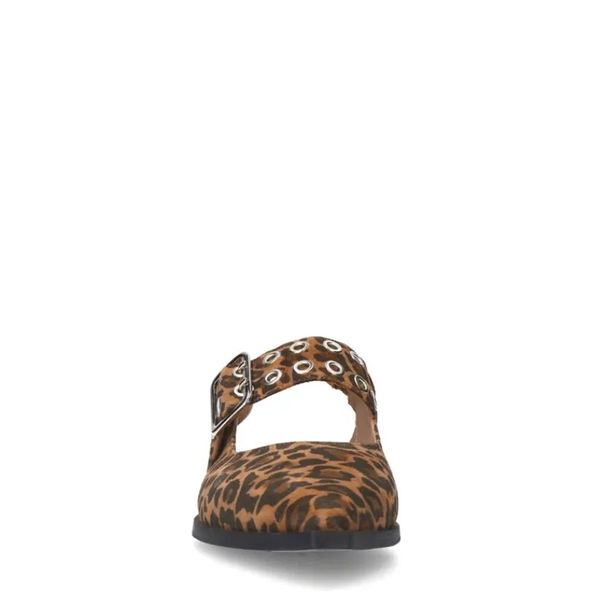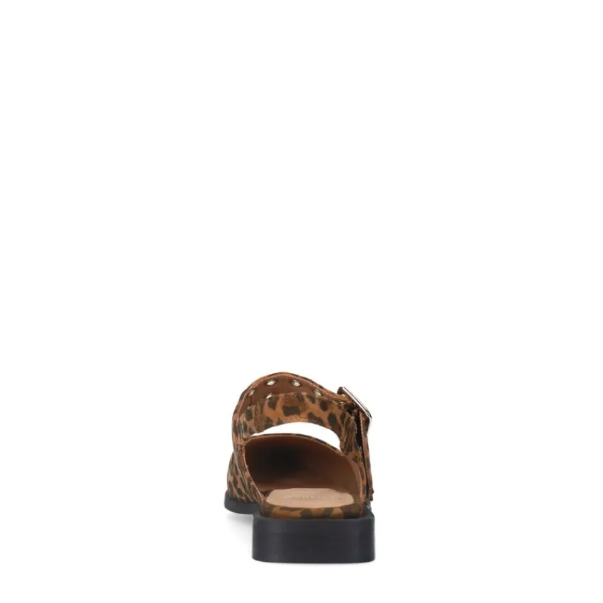 Leopard suède slingbacks van Manfield met buckle sluiting over de voorvoet, puntige neus en platte hak van 2 cm. We adviseren als verzorging en bescherming de suède/nubuck spray in transparant.