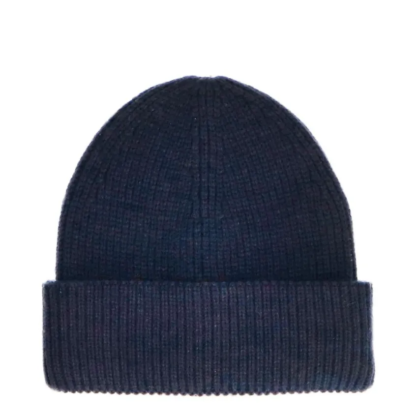 Navy beanie van Manfield met ribbels, breedte van 20 cm en lengte van 22 cm.