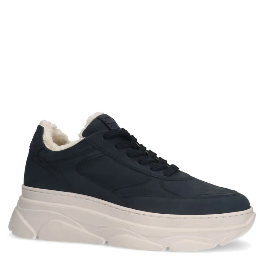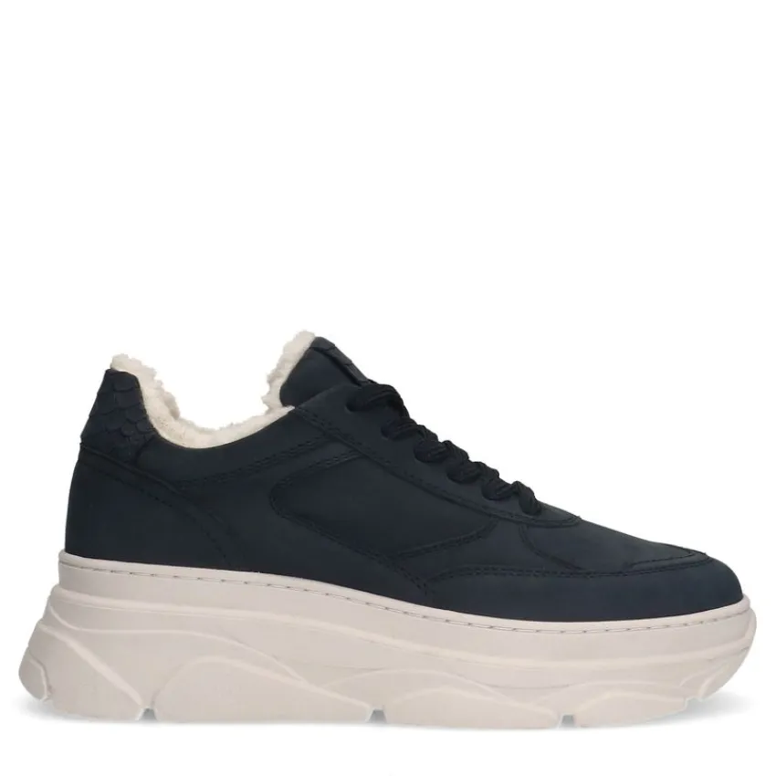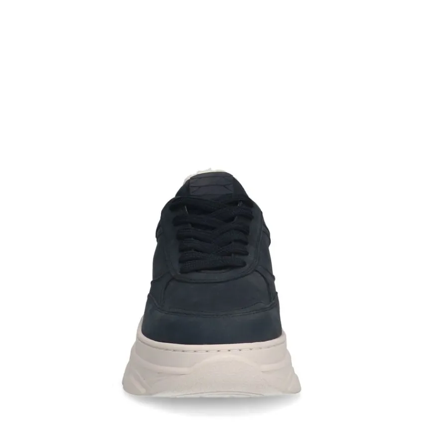 Navy blauwe nubuck sneakers van Manfield met gevoerde binnenkant en witte zool van 4 cm. We adviseren als verzorging en bescherming de suède/nubuck spray in transparant.