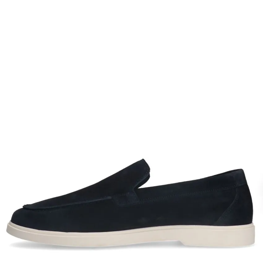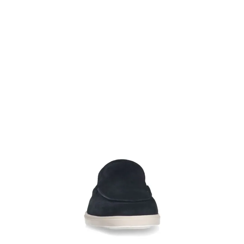 Navy suède loafers van Manfield met een platte hak van 2 cm. We adviseren als verzorging en bescherming de suède/nubuck spray in transparant.