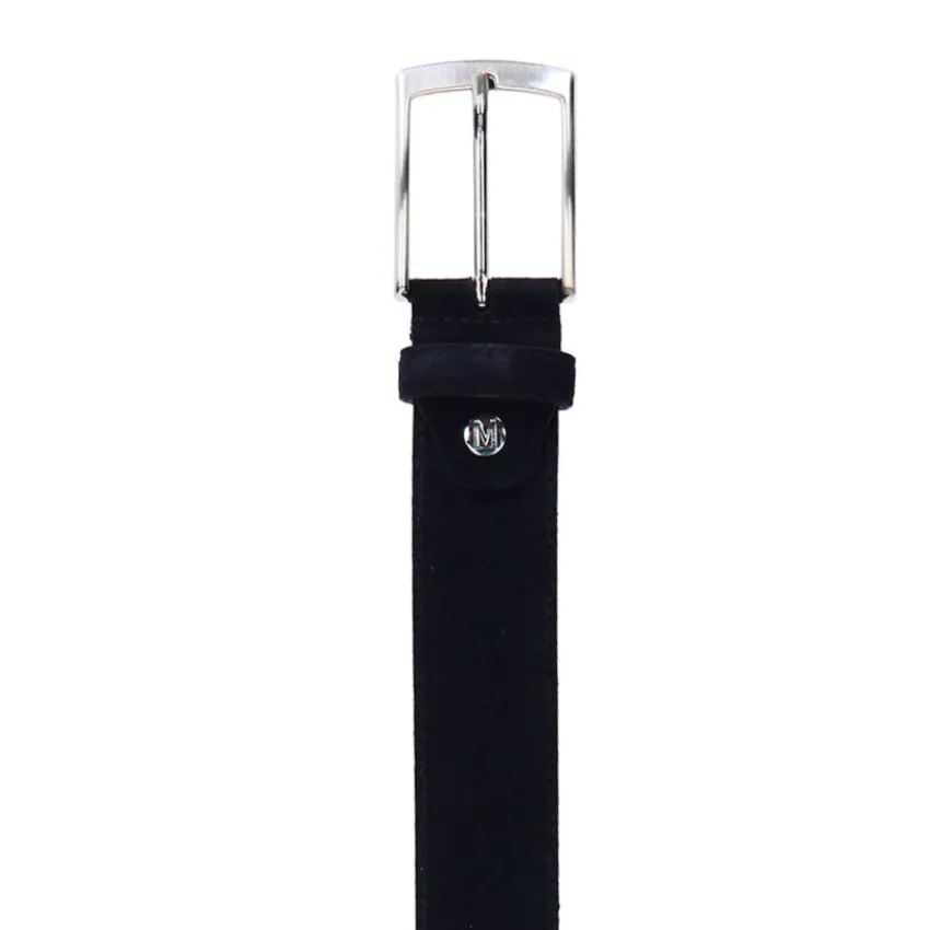 Navy suède riem met zilveren gespsluiting van Manfield. De riem heeft een breedte van 3,5 cm en een lengte van 110 cm.
