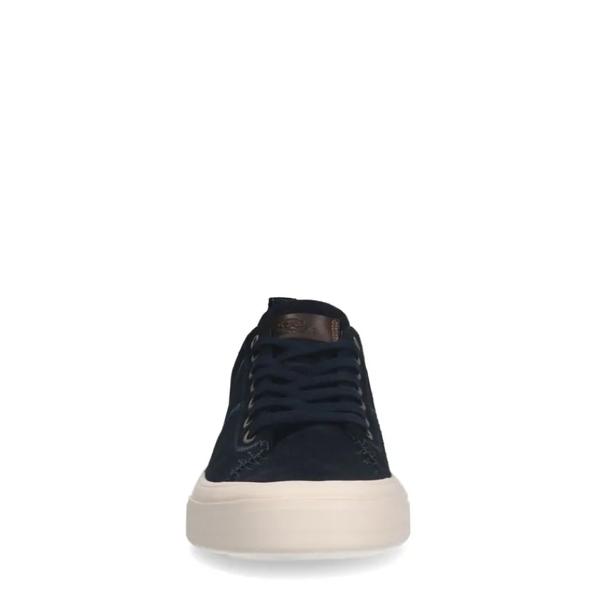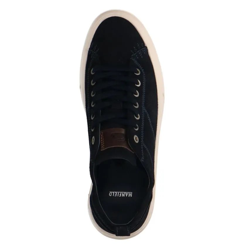 Navy suède sneakers van Manfield met een crème zool van 3 cm. We adviseren als verzorging en bescherming suède/nubuck spray in transparant.