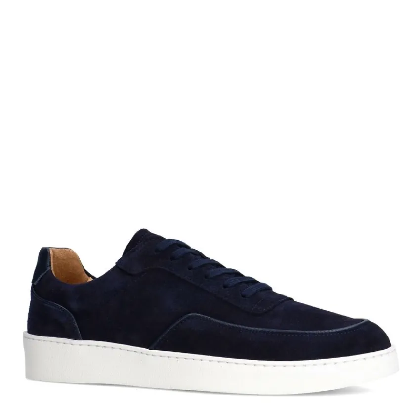 Navy suède sneakers van Manfield met witte zool van 3 cm. We adviseren als verzorging en bescherming de suède/nubuck spray in transparant.