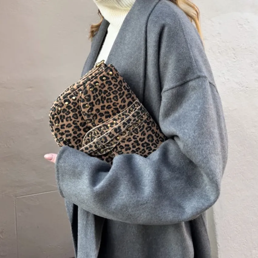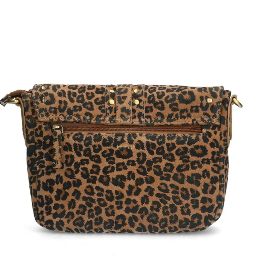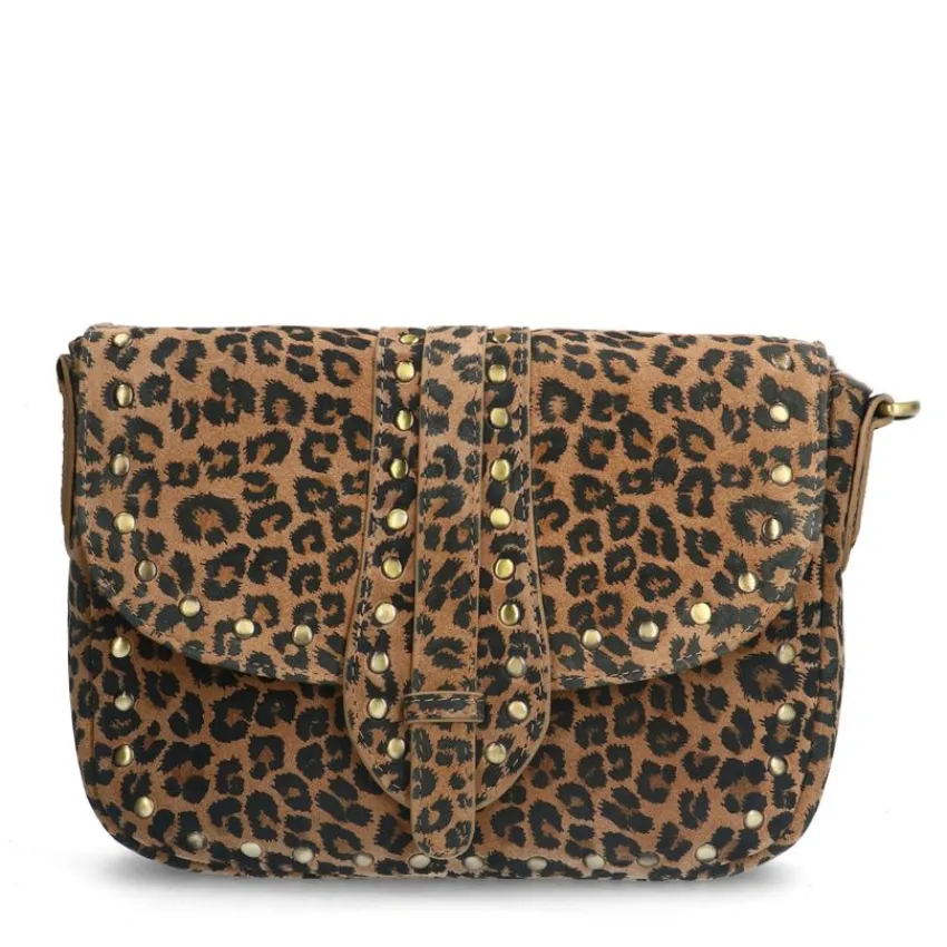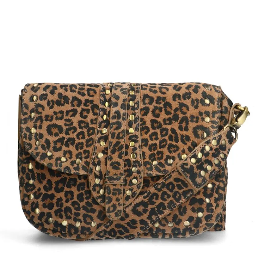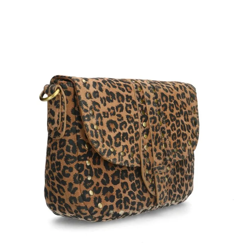 Panter suède schoudertas met strik van Manfield. De afmeting van deze tas is 25x18x2 cm (BxHxD), voorzien van een verstelbare schouderband van 141 cm en een ritssluiting aan de bovenkant en aan de zijkant.